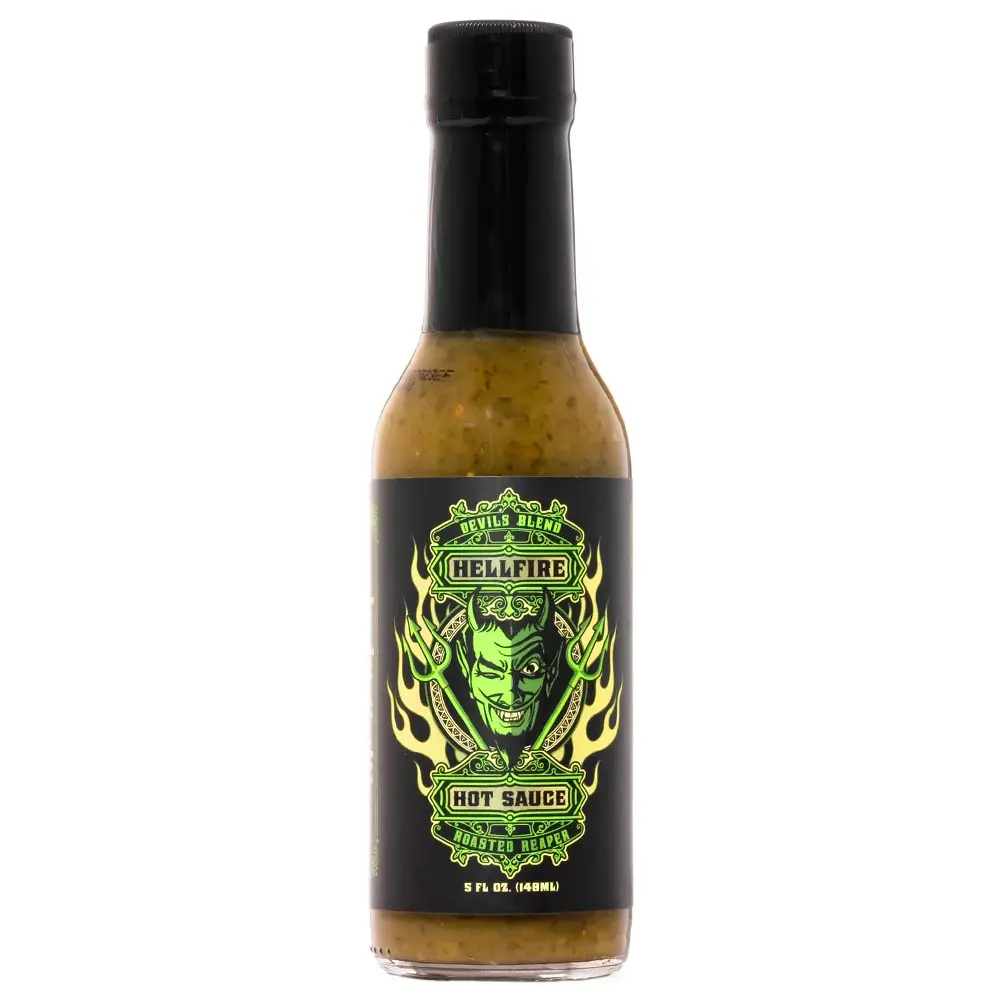 La Devil’s Blend Roasted Reaper de Hellfire est une sauce culte, directement venue des États-Unis , et rendue célèbre par ses apparitions dans l’émission Hot Ones US, notamment en saison 14 (n°4). Elle allie la chaleur maîtrisée du Carolina Reaper vert à la fraîcheur du Jalapeño rôti, relevée par des notes d’ail, de coriandre et de tomatillo pour un goût équilibré, vif et délicieusement addictif 🌶️.